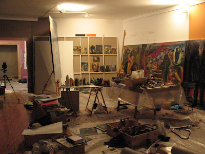 Imagens da "residência". Um tríptico grande de um lado em finalização e mais três outros grandes iniciados. Ao fundo estão mais alguns de tamanho reduzido.